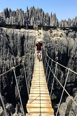 Difficilement accessibles, les tsingy abritent un écosystème qui a gardé une grande partie de ses mystères. En effet, 60% du massif reste inexploré et des espèces endémiques s'y sont développées. Lors de notre excursion, on passe de la forêt aux grottes, puis à un pont suspendu pour arriver aux roches et enfin aux tsingy. Notez que c’est accessible à tous, petits et grands grâce aux sentiers extrêmement bien aménagés.