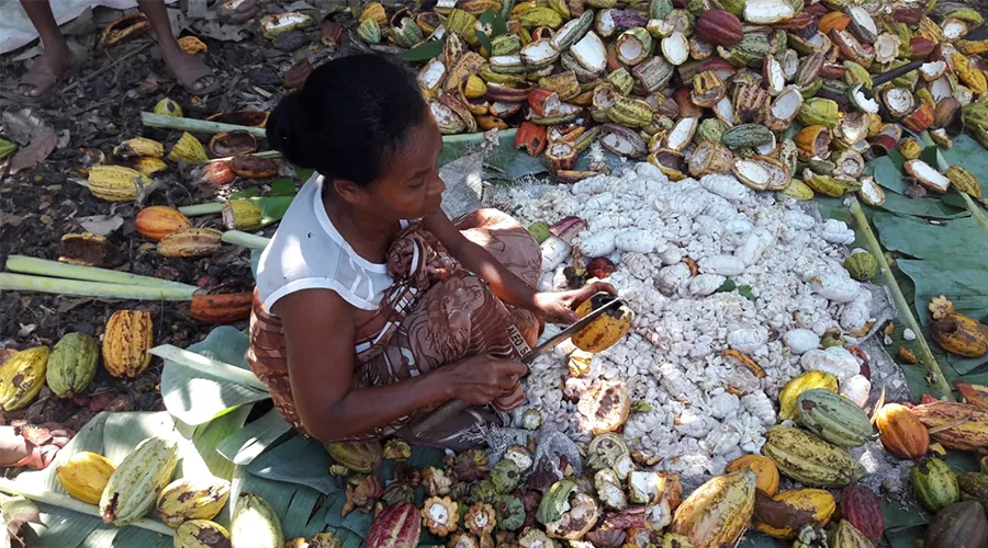 Depuis son introduction, le cacao a toujours été une affaire de femmes. C’est elles qui en font la cueillette et vident tout de suite les cabosses de leurs fèves, direction les bacs de fermentation, une étape importante de la production, avec cette odeur entêtante si particulière.